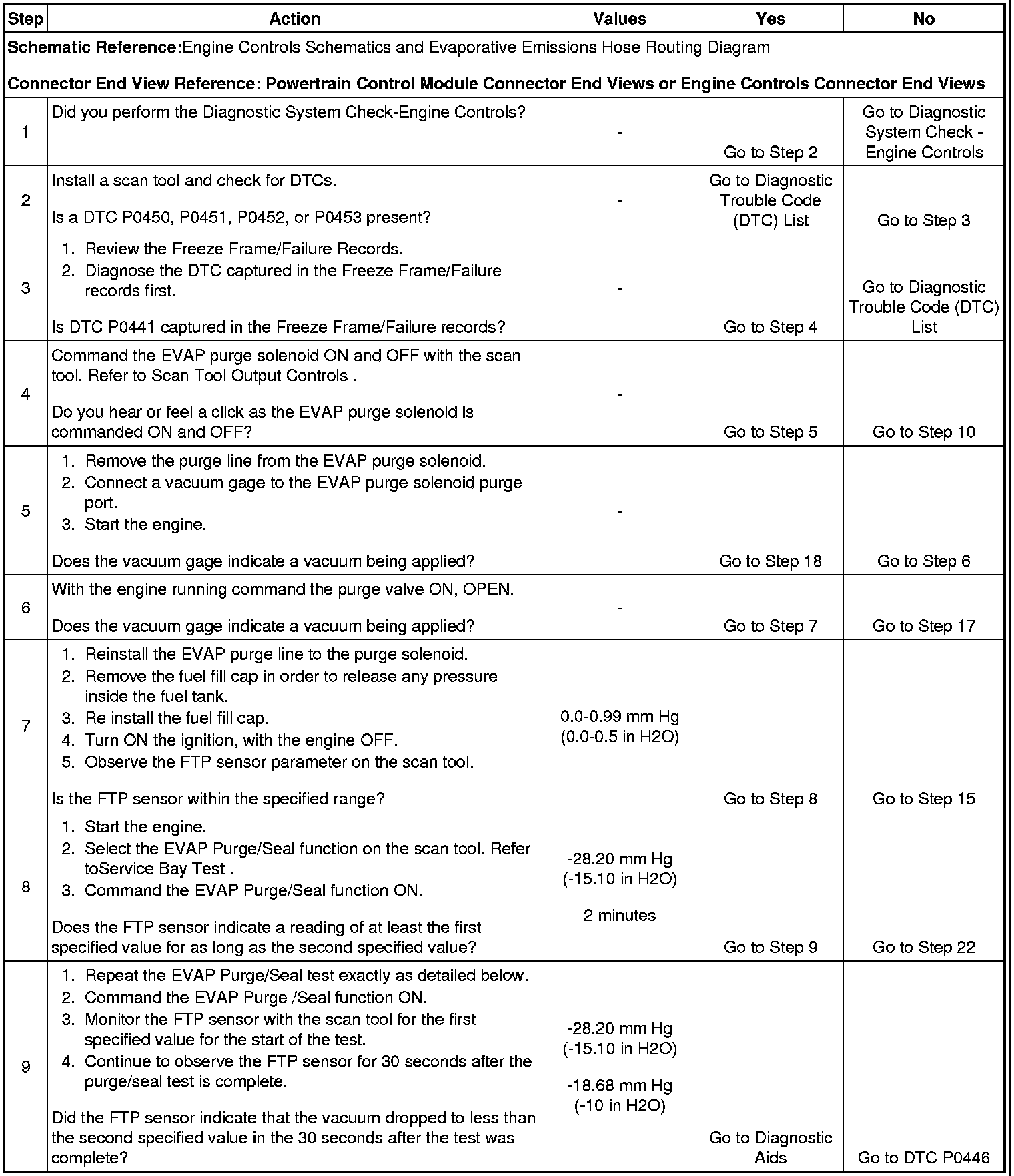 9. This step tests for a blockage or restriction in the EVAP canister vent valve and hoses. If the vacuum does not drop to less than -18.68 mm Hg (-10.0 inches H2O) after 30 seconds, there is a faulty condition in the EVAP vent system. The EVAP vent portion of the EVAP control system is diagnosed in DTC P0446.