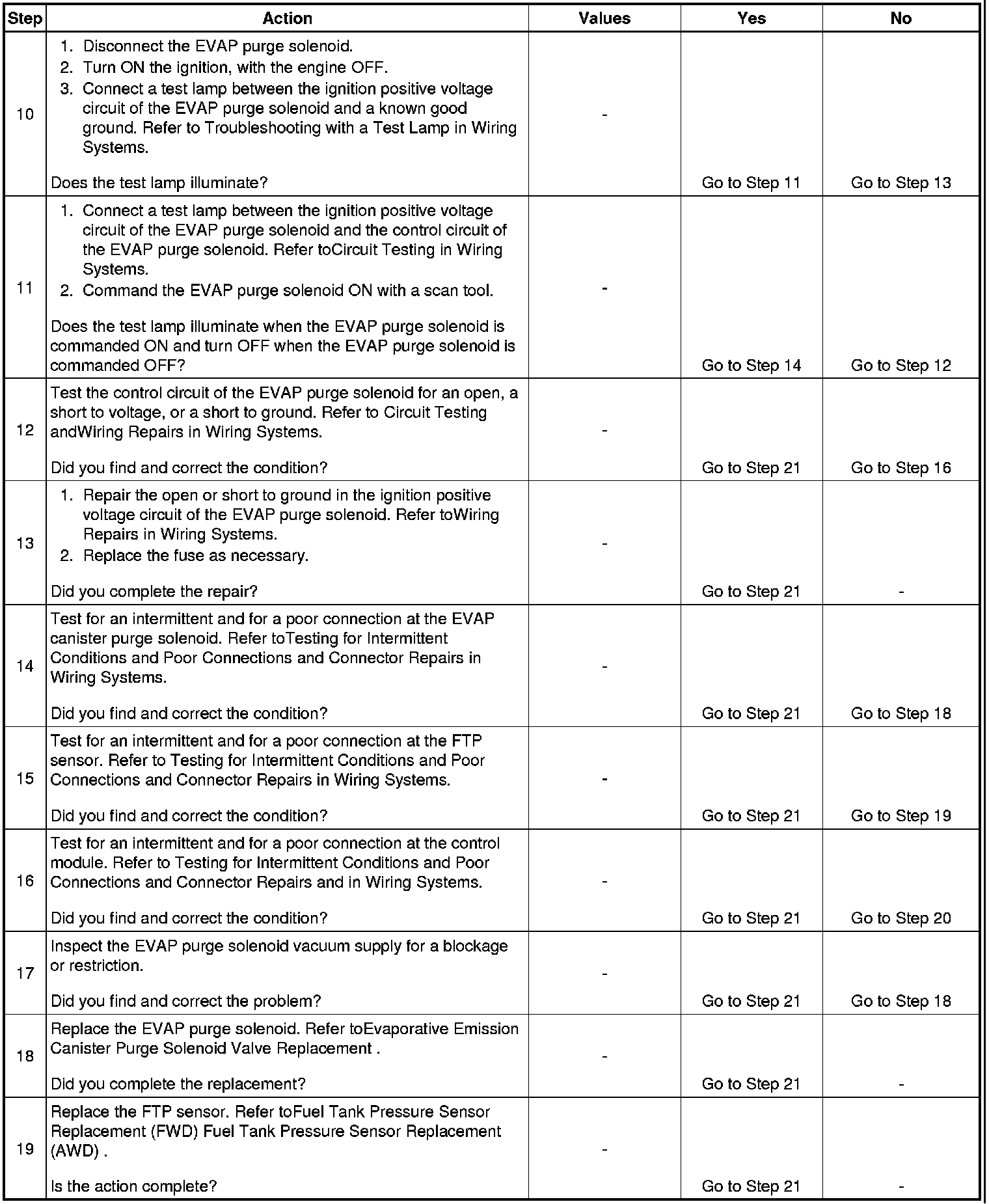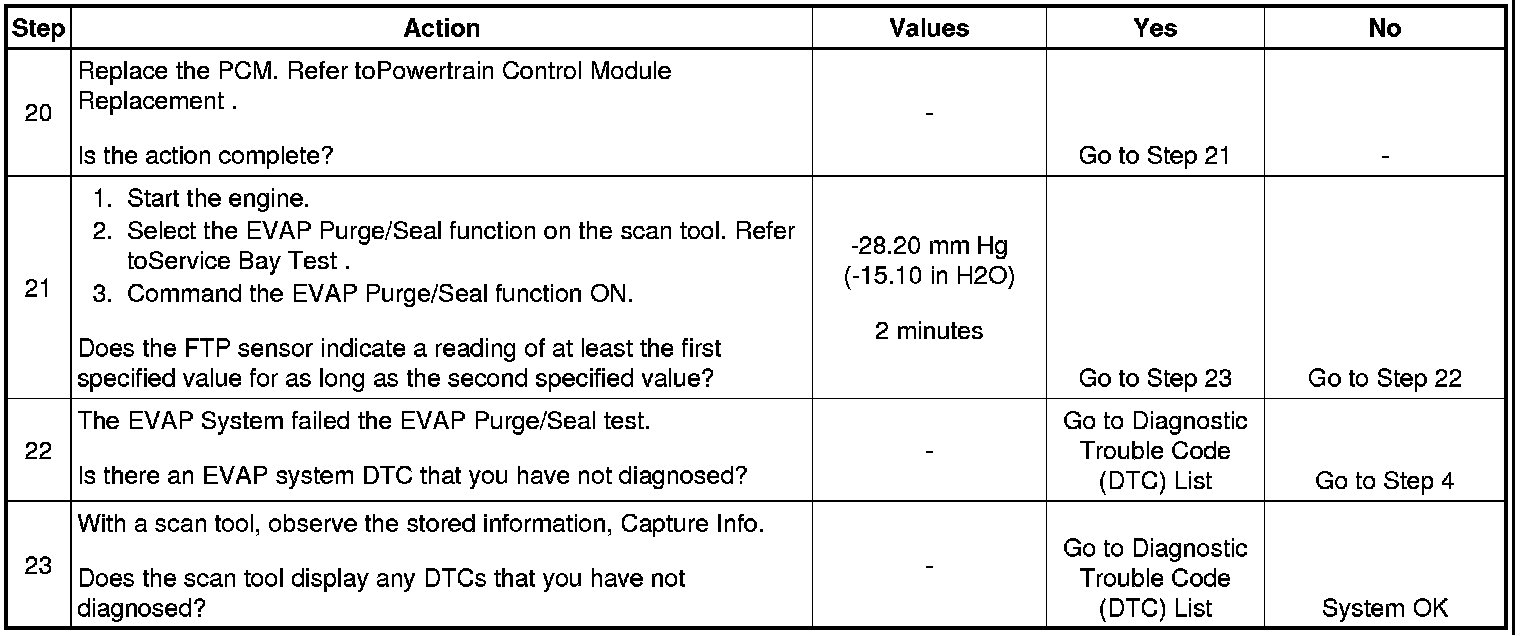 21. This step uses the EVAP Purge/Seal function to test for the correct operation of the EVAP canister vent solenoid, the pressure switching solenoid, and the purge solenoid. Using the EVAP Purge/Seal function also tests for leaks by allowing the technician to seal the system and monitor the FTP sensor.