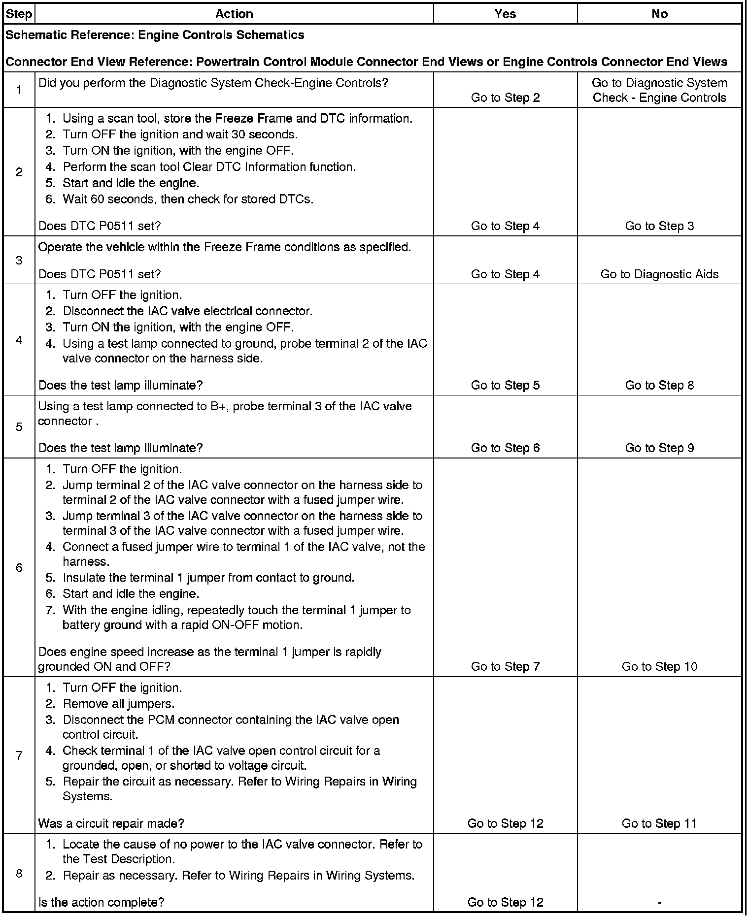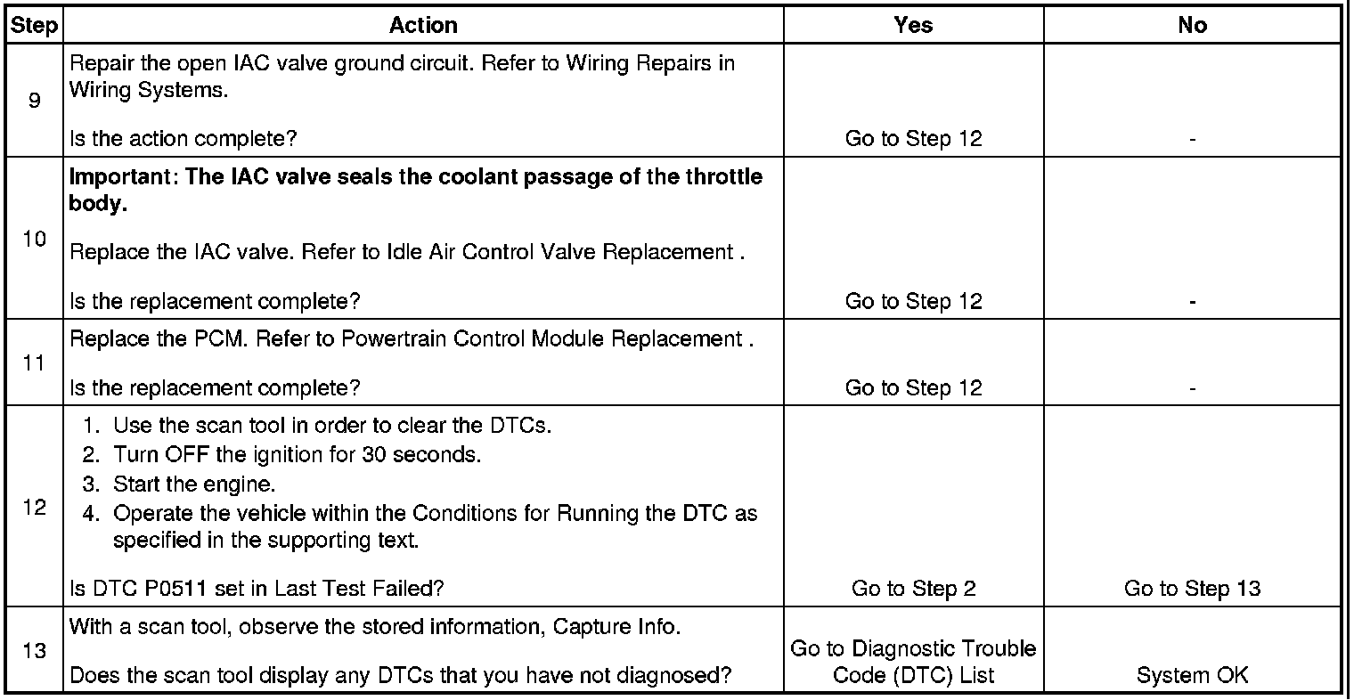 * The scan tool can be used to isolate the cause of an intermittent DTC P0511. Engine idle speed can be controlled with the scan tool. Operate the IAC valve with the scan tool while checking for a smooth increase and decrease in engine speed. If engine speed can be controlled, the IAC system is functioning normally.