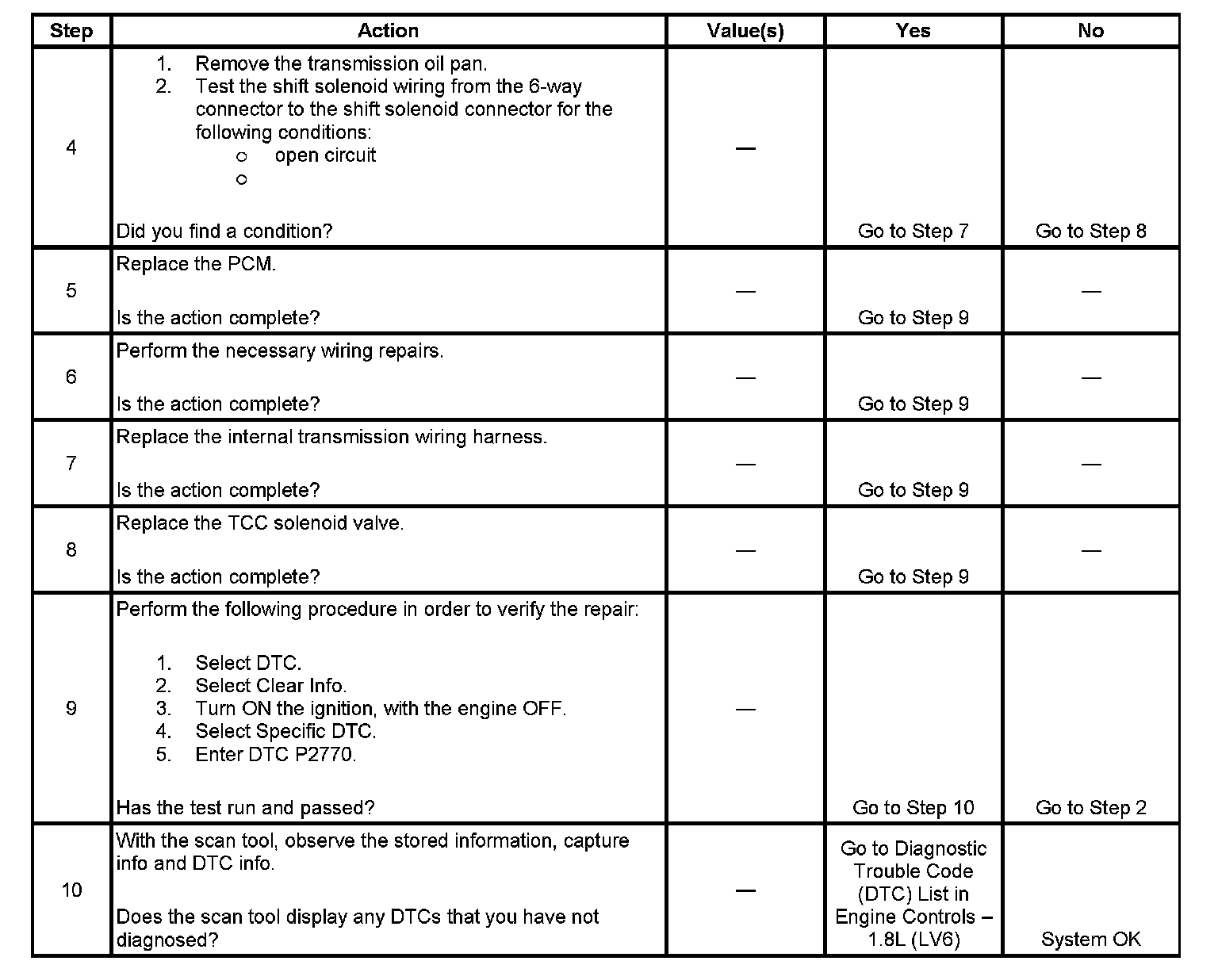 When the PCM detects a continuous open in the TCC solenoid valve circuit, then DTC P2770 sets.