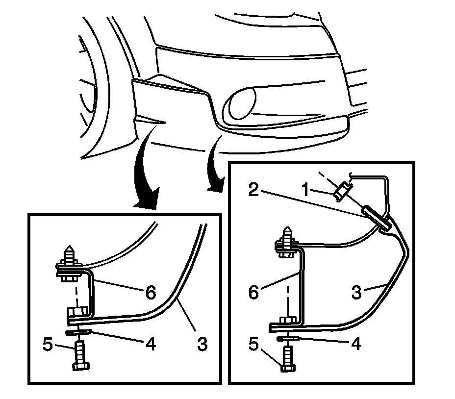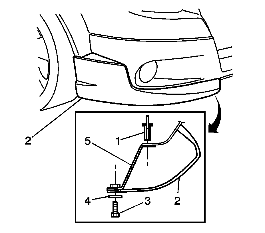 8. Install the bracket (5) to the front bumper fascia extension (2).