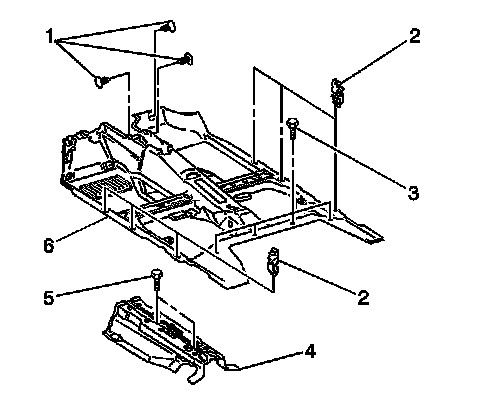 14. Remove the 4 plastic retainers (3) which secure the rear of the floor panel carpet (6).