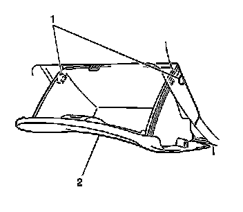 1. Install the instrument panel storage compartment tray (1) to the instrument panel (2).