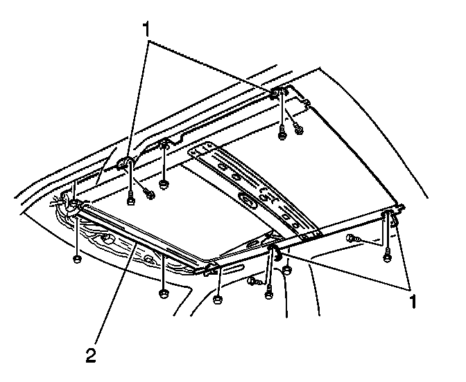 7. Install the sunroof housing (2) to the vehicle. Secure the housing with the 6 nuts.