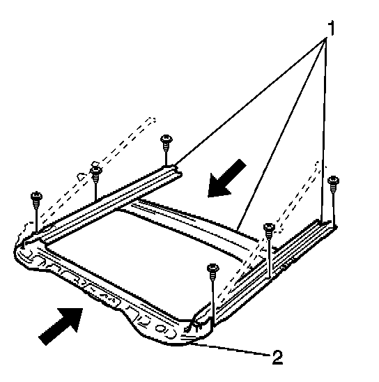 3. Install the sunroof housing front support (1) to the sunroof housing (2). Secure the support with the 6 screws.