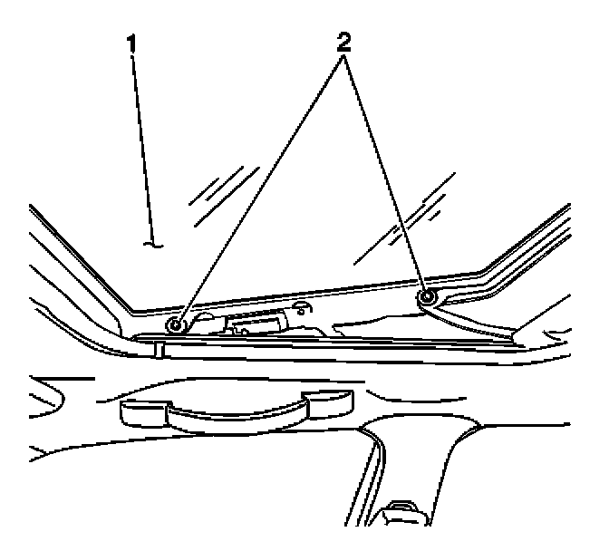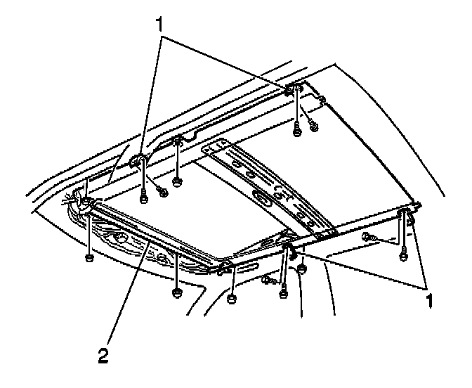 15. Install the sunroof window (1) to the vehicle. Secure the window with 2 screws (2) at each side. Do not tighten fully.