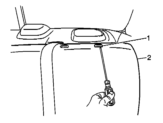 3. Gently pry loose the head restraint guide (1). Remove the guides from the seat back cushion (2), if necessary.