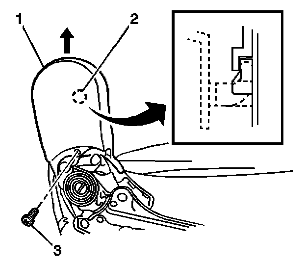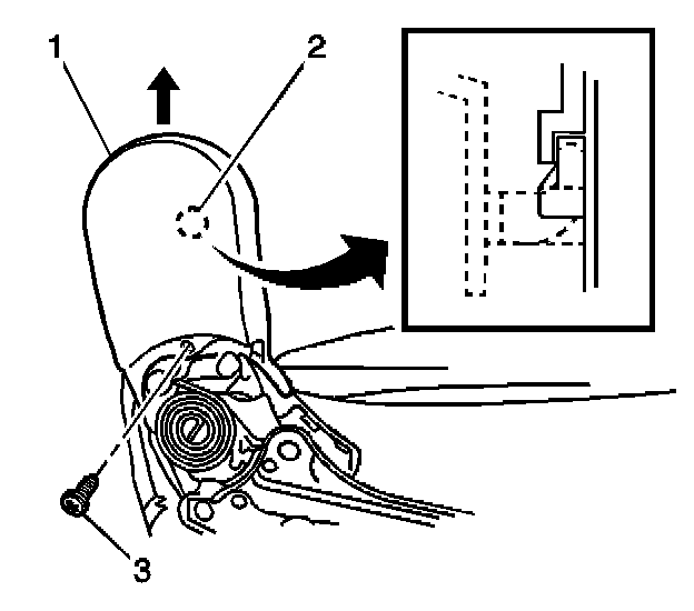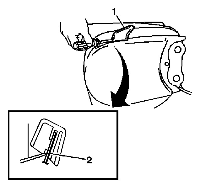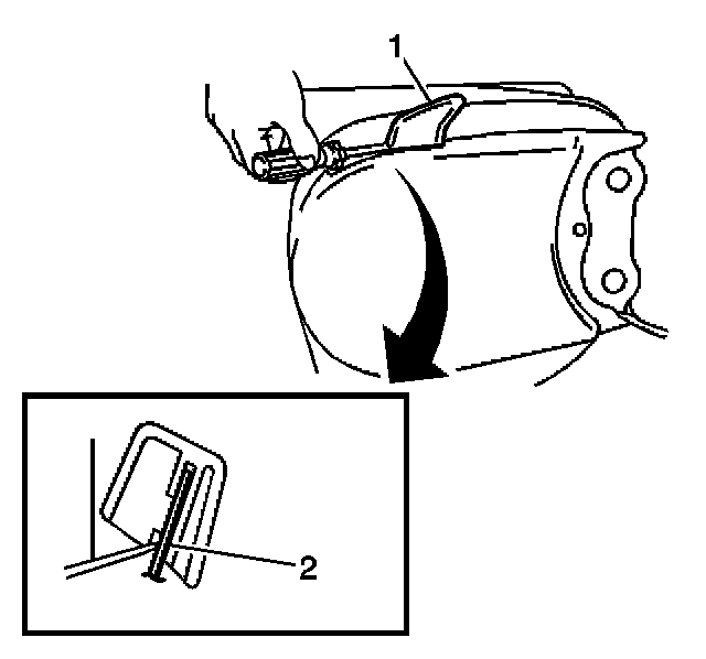 3. Using a flat-bladed tool, remove the recliner handle (1) from the front seat outboard adjuster by disengaging the retaining tab (2).