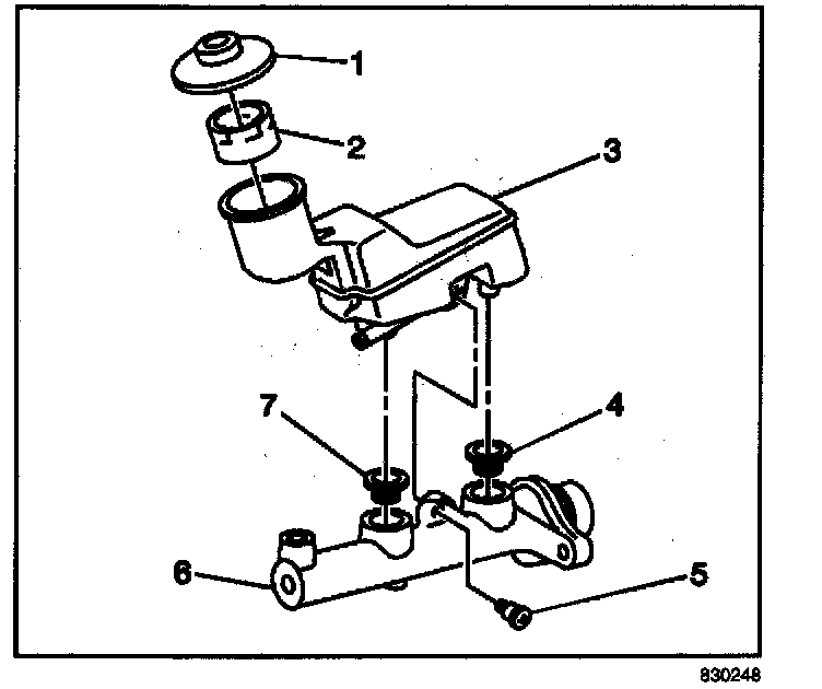 1. Remove the master cylinder (6) from the vehicle. Refer to Master Cylinder Replacement (Non-ABS) or Master Cylinder Replacement (ABS). Master Cylinder Replacement