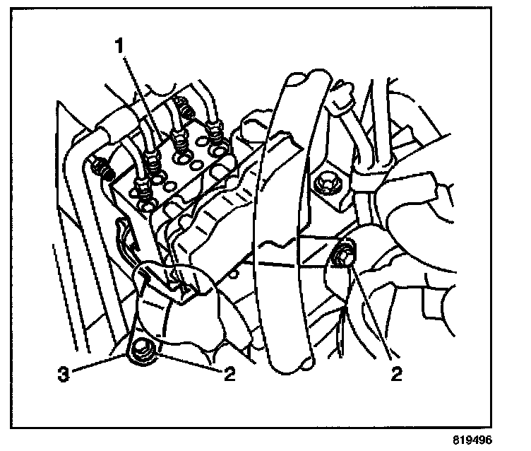 4. Remove 2 bolts (2) from the brake pressure modulator bracket (3).