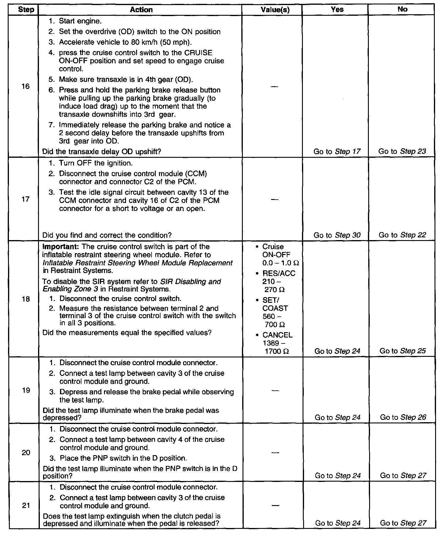 4. This step places the cruise control module in a functional test mode to allow testing of the; Cruise control switch circuit, brake switch circuit, the vehicle speed sensor (VSS) circuit PNP switch circuit, if equipped, and the cruise release switch circuit, if equipped.
