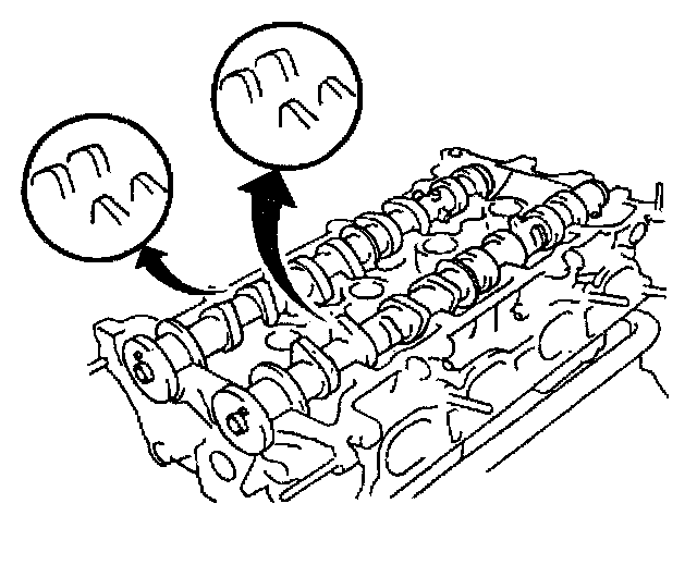 2. Install the intake camshaft onto the cylinder head with the number 1 cam lobes facing as shown.
