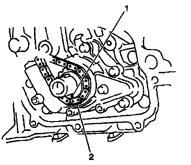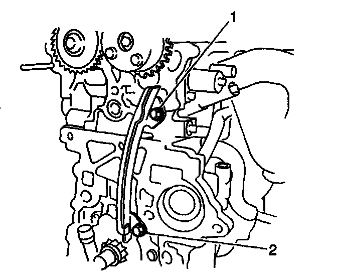 4. Install the timing chain shoe. Secure the timing chain shoe using two bolts (1, 2).