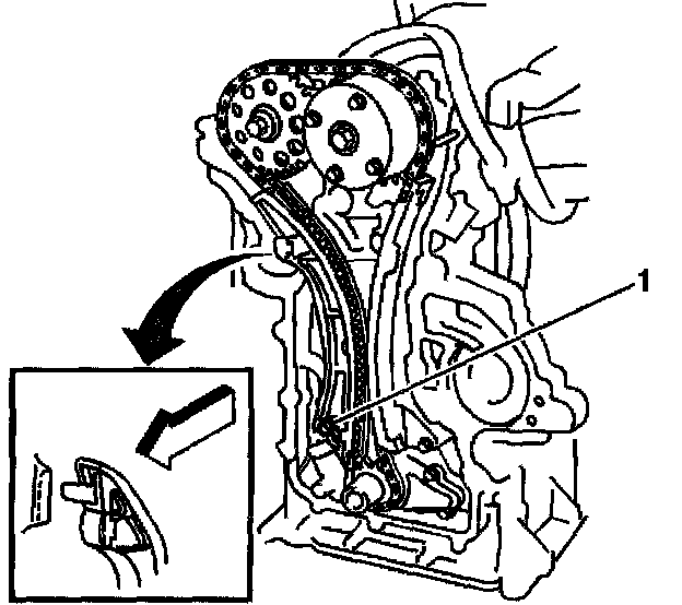 7. Install the timing chain dampener. Secure the timing chain dampener using one bolt (1).