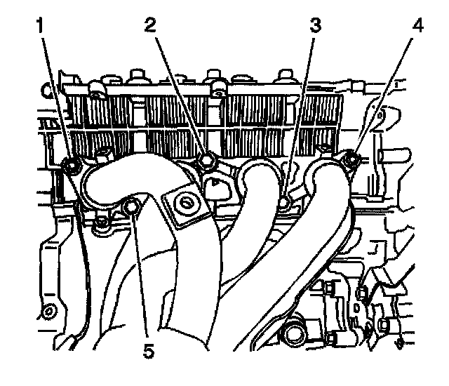 2. Install the 3 exhaust manifold bolts (1-3) and 2 exhaust manifold nuts (4-5).