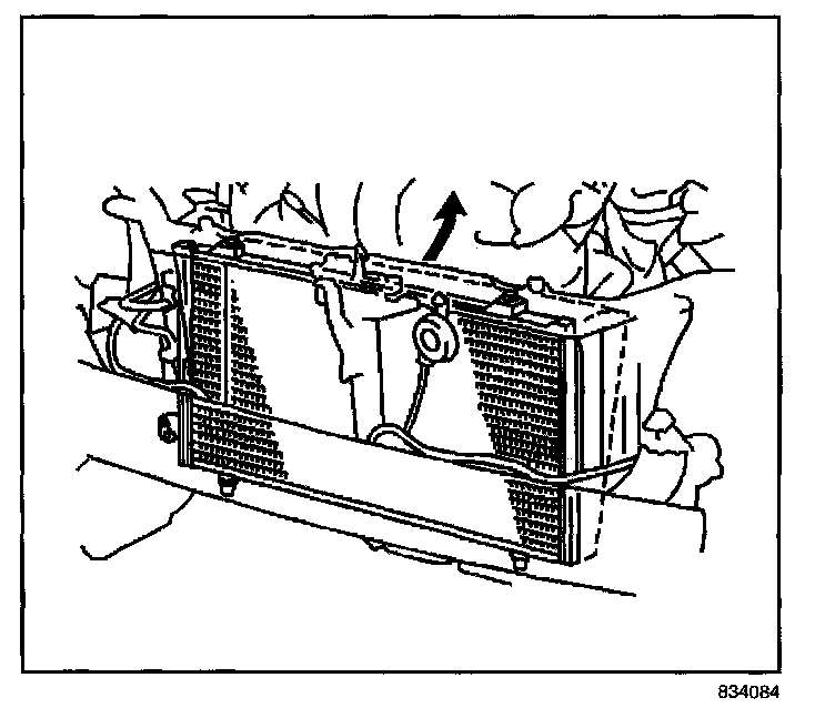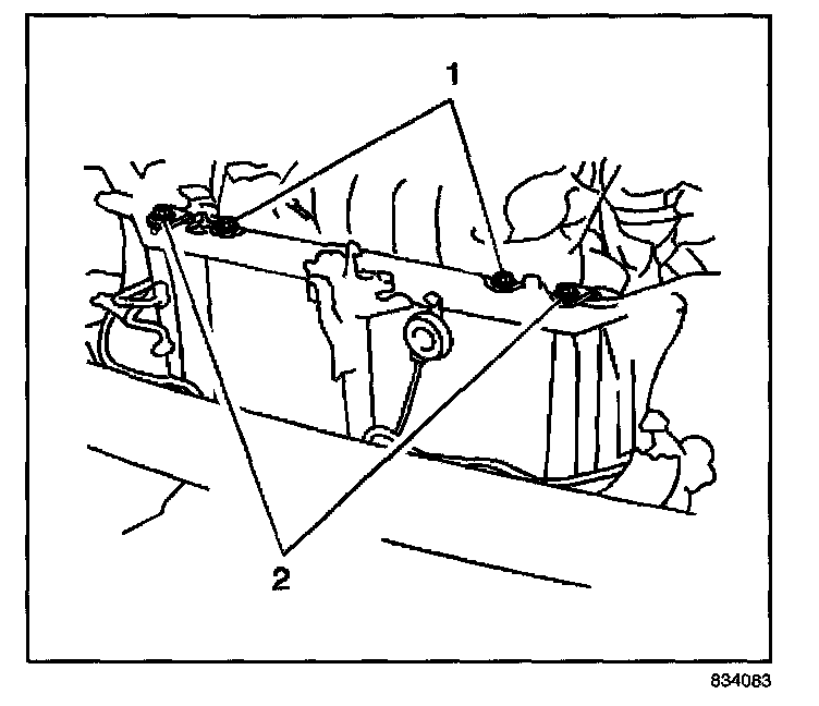 5. Remove the 2 bolts (2) from the radiator support bracket.