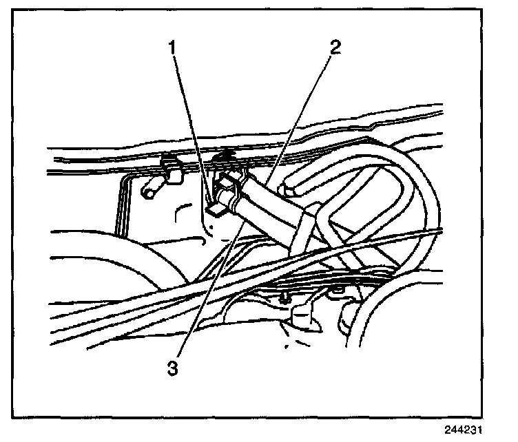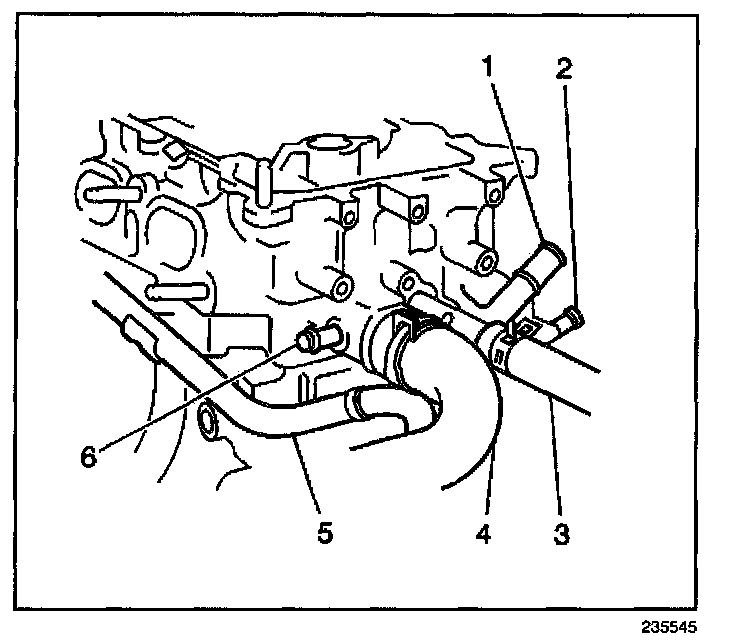 3. Remove the clamps and the inlet and outlet hoses (1, 3) from the engine cylinder head.