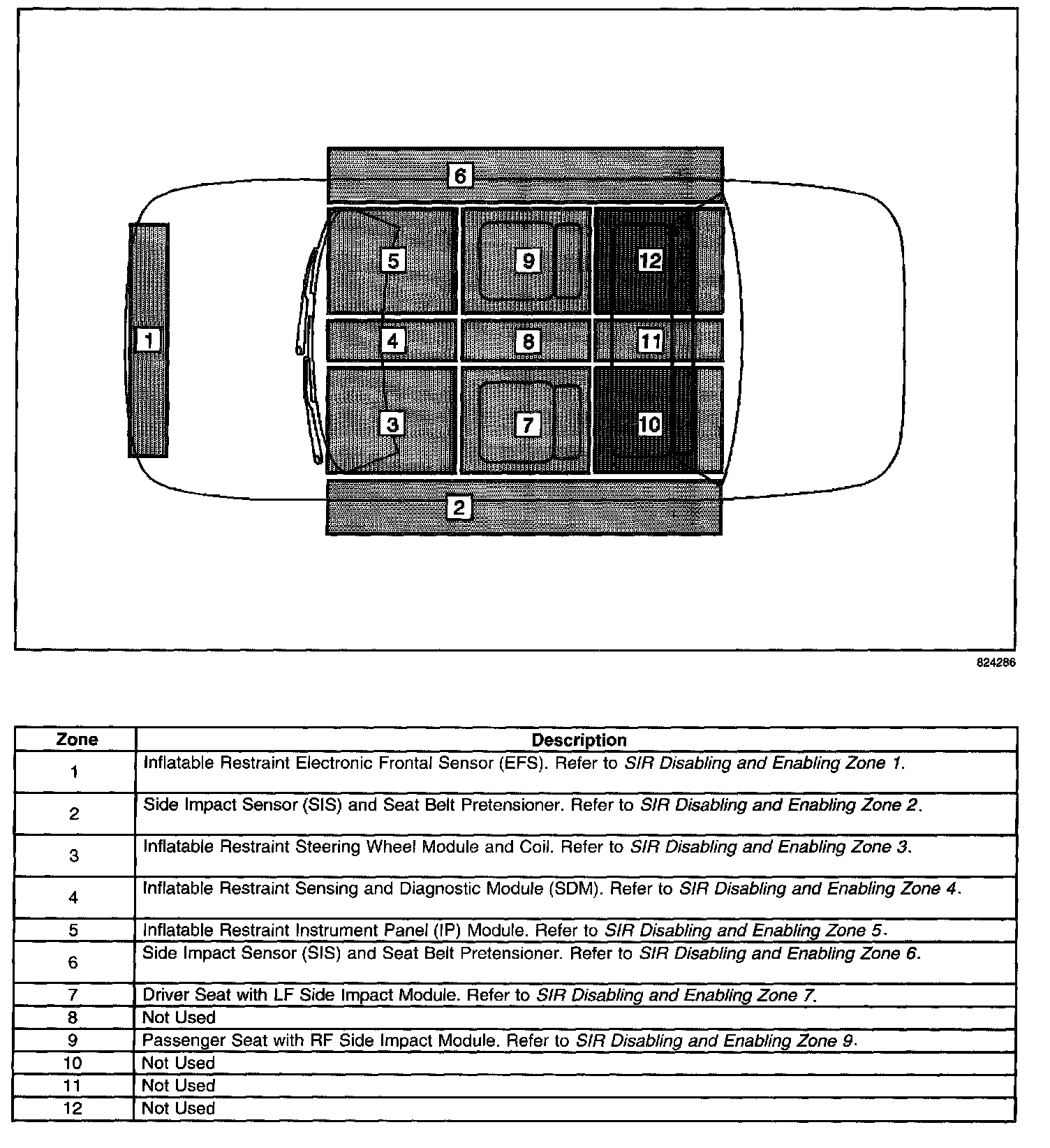 It may be necessary to disable more than one zone depending on the location of other SIR components and the area being serviced, refer to SIR Zone Identification views Refer to the illustration, to identify the specific zone or zones in which service will be performed. After identifying the zone or zones, proceed to the disabling and enabling procedures for that particular zone or zones.