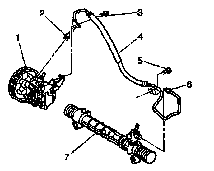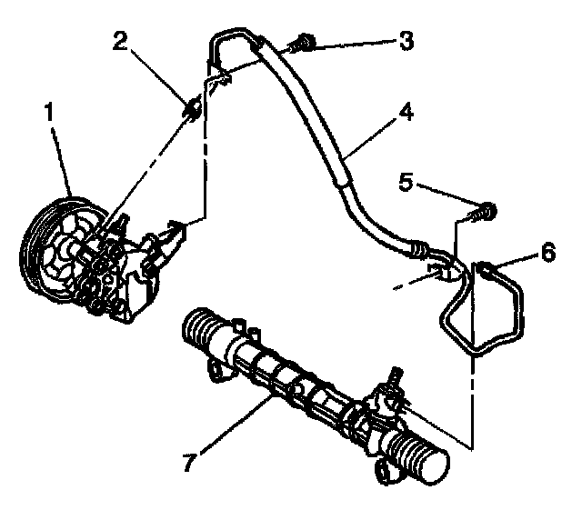 3. Remove the pipe fitting (6) and the gear inlet hose from the steering gear (7).