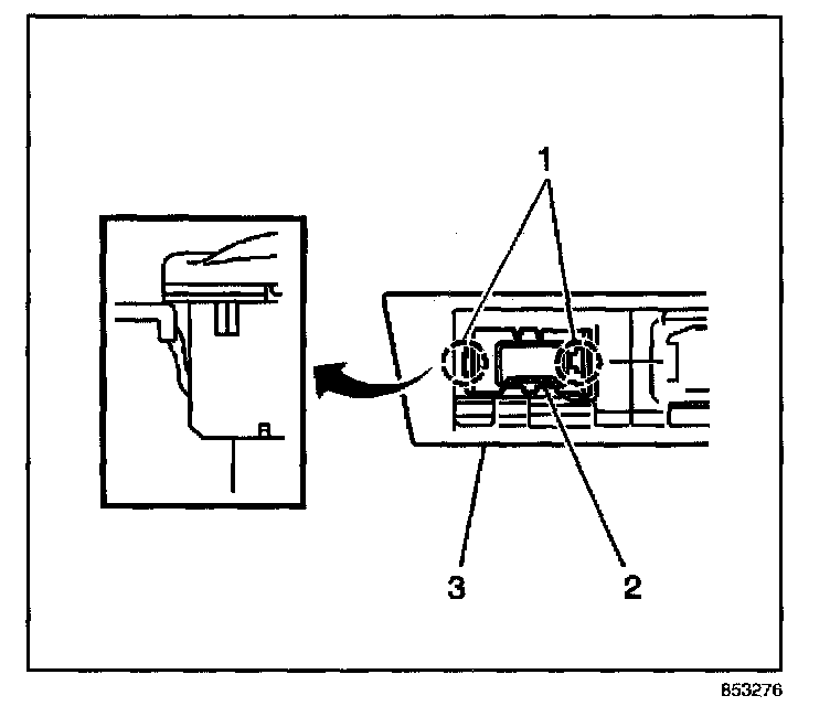 4. Disengage the 2 clips (1) on the accessory power receptacle (2).