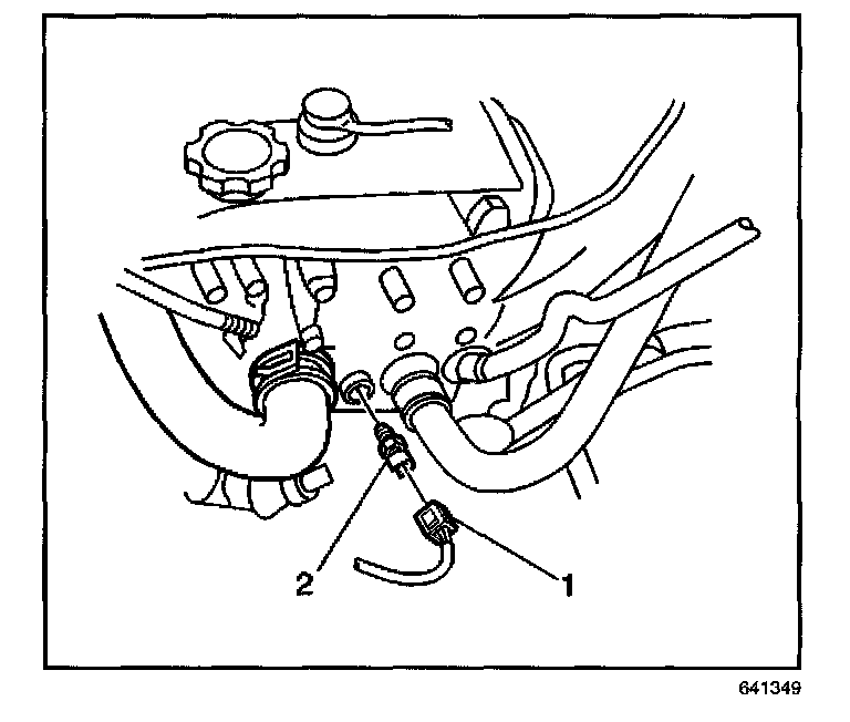 2. Disconnect the ECT sensor electrical connector (1) from the ECT sensor (2) located next to the upper radiator hose on the cylinder head.