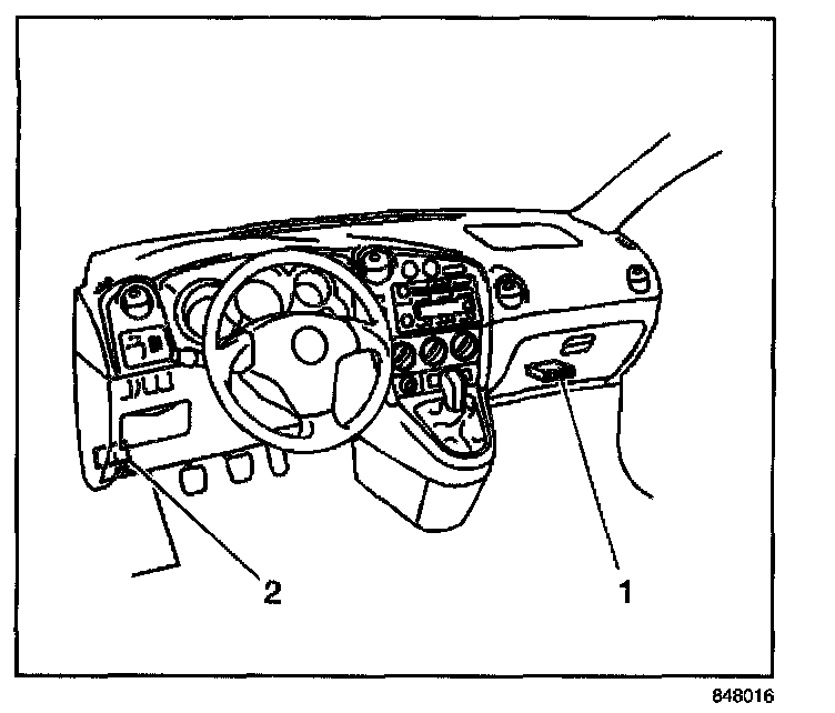 POWERTRAIN CONTROL MODULE (PCM) DESCRIPTIONThe powertrain control module (PCM) is a precision 32-bit microprocessor and is an essential part of the electronic control system. The PCM (1) is located below the instrument panel (IP) storage compartment. Communication with the PCM is through the data link connector (2) located on the left side below the IP. The PCM performs the OBD II diagnostic tests of the emission related systems. The PCM supplies a buffered voltage, called reference voltage, to the various information sensors and switches. The PCM controls most components with an electronic switch that completes a ground circuit when turned ON. The electronic switch is commonly referred to as an output driver. The PCM is also responsible for a self-diagnosis function and a fail-safe function.