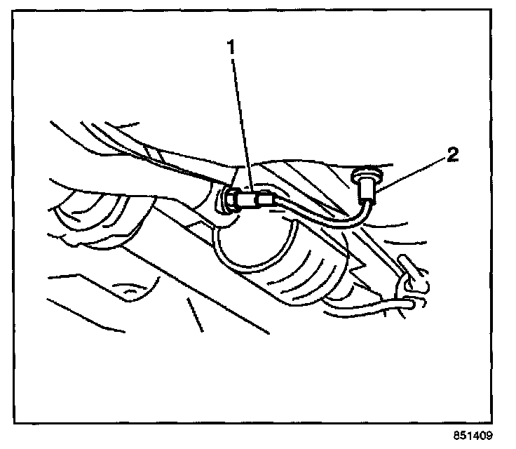 6. Remove the HO2S 2 wiring pigtail and body plug (2) from the floor pan.
