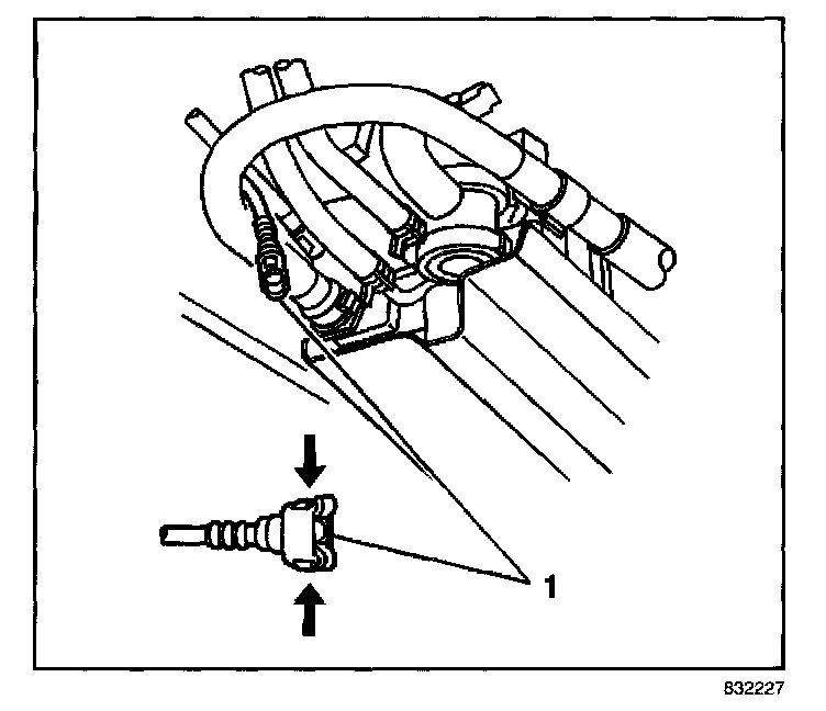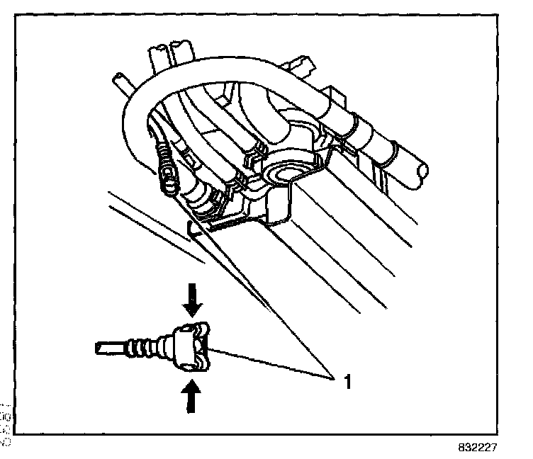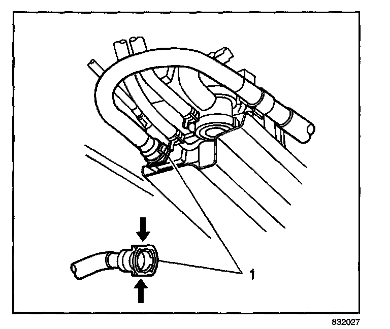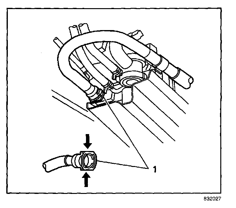 6. Connect the ORVR vent line (1) to the EVAP canister port by pinching both sides of the hose connector (1).