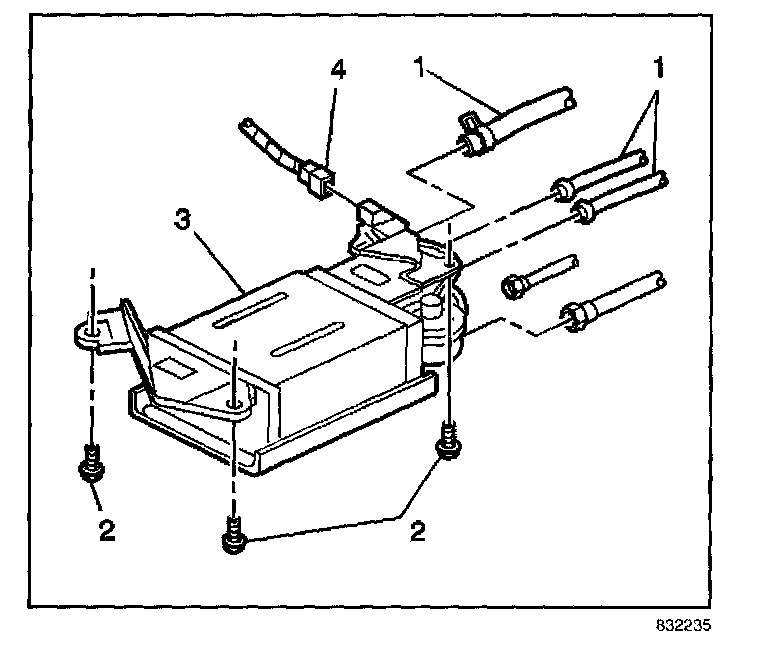 1. Install the EVAP canister (3) to the vehicle underbody and secure with the 3 bolts (2).