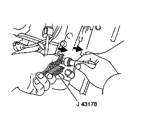 6. Disconnect the coupling for the fuel feed hose from the fuel feed pipe of the fuel rail using the J 43178 . Use a shop towel in order to catch any remaining fuel that may leak. Refer to Metal Collar Quick Connect Fitting Service (Quick Connect Fitting(S) Service (Metal Collar)).