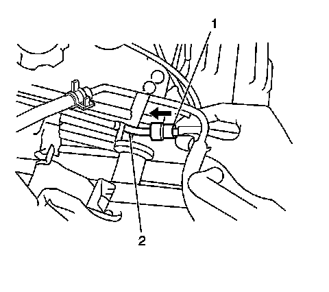 10. Connect the quick-connect fitting (1) for the fuel feed hose to the fuel feed pipe (2) of the fuel rail. Refer to Metal Collar Quick Connect Fitting Service (Quick Connect Fitting(S) Service (Metal Collar)).