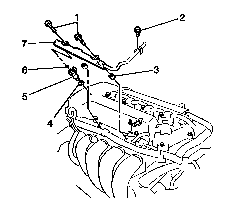 13. Remove the fuel rail (7) and the spacers (3) from the engine.