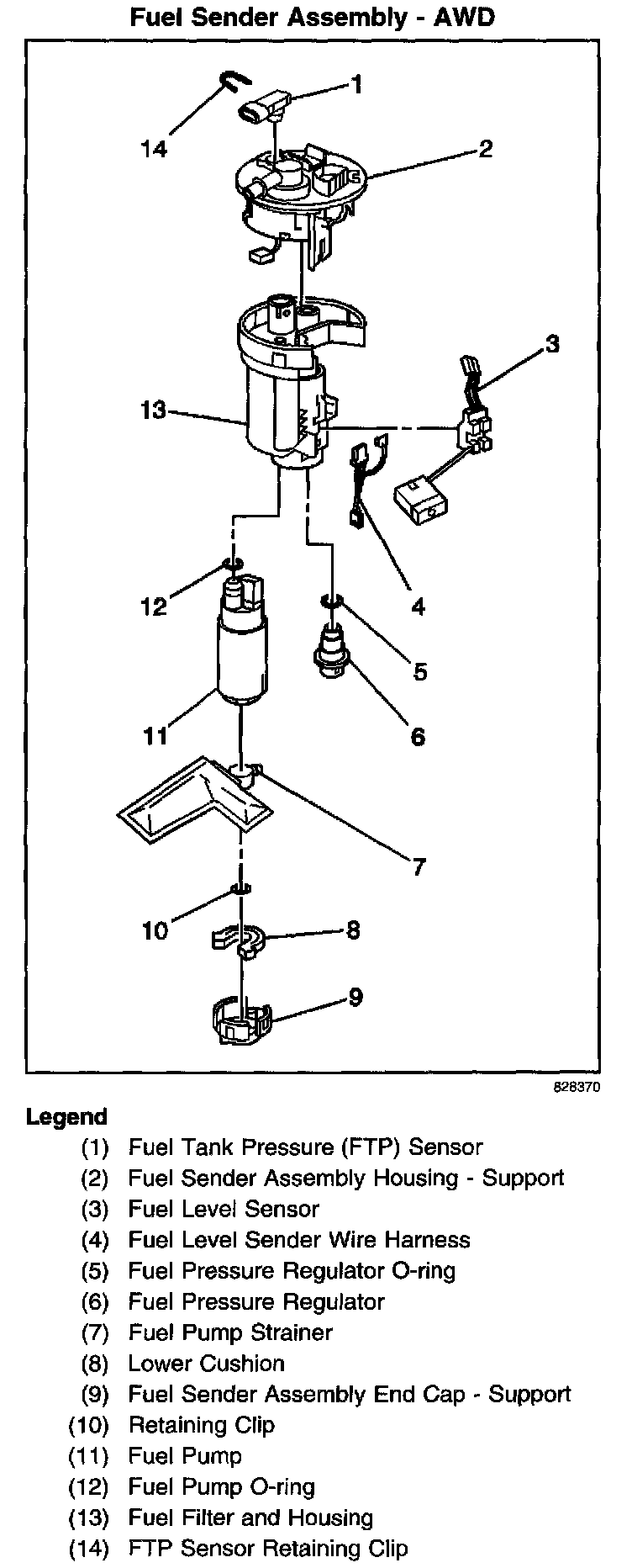 FUEL SENDER ASSEMBLYThe fuel sender assembly is located in the fuel tank. The fuel sender assembly contains the electric fuel pump, the fuel level sensor, the fuel pressure regulator, and the fuel filter. Most of the fuel sender assembly components can be serviced separately.