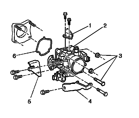 3. Install the throttle body bracket (4) and the 2 bolts to the throttle body.