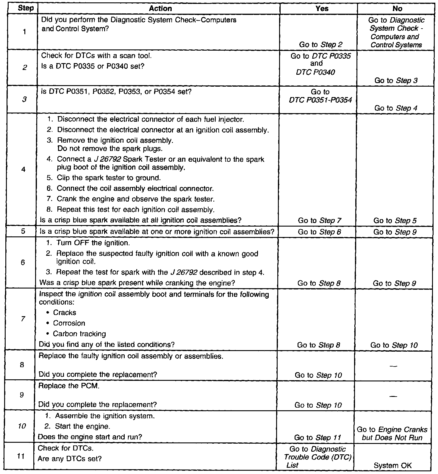 10. This step checks whether the engine will start and run. A repair that has been performed leading to this step may only have been a contributing cause of a no start condition. Returning to the Engine Cranks but Does Not Run diagnostic table will locate additional causes of the no start condition.