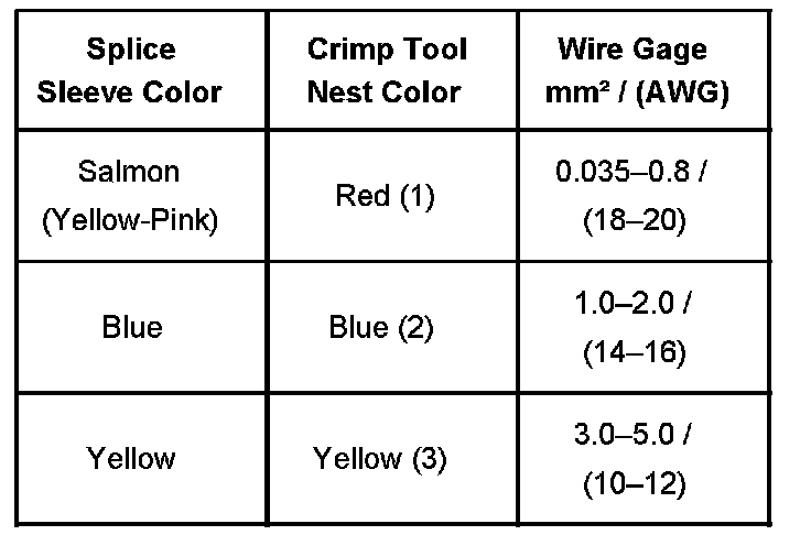 4. Select the proper sealed splice sleeve according to the wire size. Refer to the table at the beginning of the repair procedure for the color coding of the splice sleeves and the crimp tool nests.