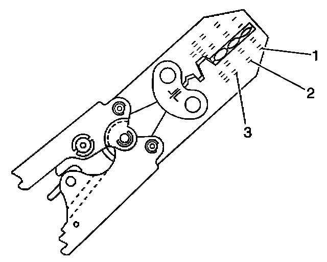 6. Place the splice sleeve in the nest. Ensure that the crimp falls midway between the end of the barrel and the stop. The sleeve has a stop (3) in the middle of the barrel (2) in order to prevent the wire (1) from going further. Close the hand crimper handles slightly in order to firmly hold the splice sleeve in the proper nest.
