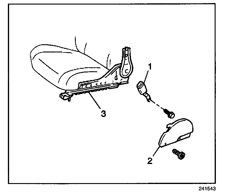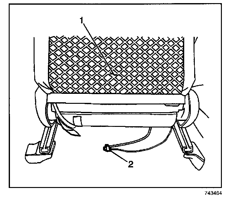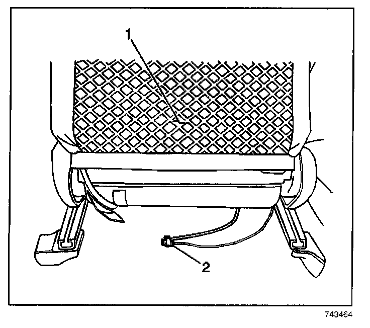 2. Position the front seat (1) in a forward position in order to gain access to the seat belt switch electrical connector (2), on the left front buckle only.