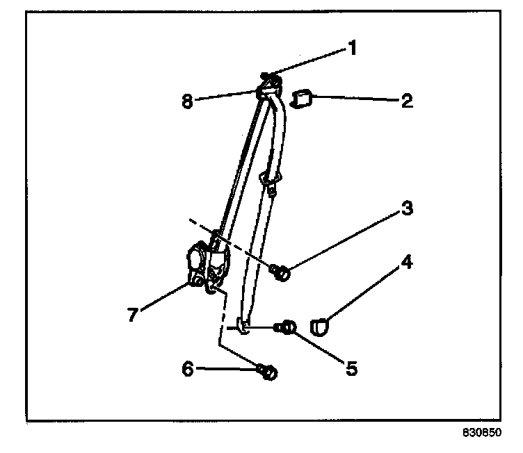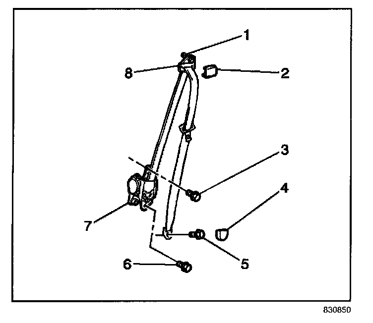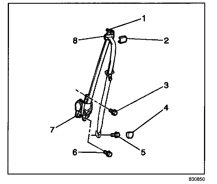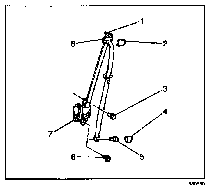 1. Install the front seat belt retractor (7) to the vehicle. Secure the retractor with the upper bolt (3) and the lower bolt (6).