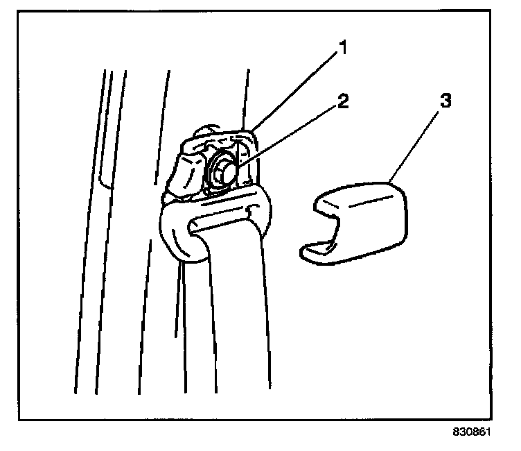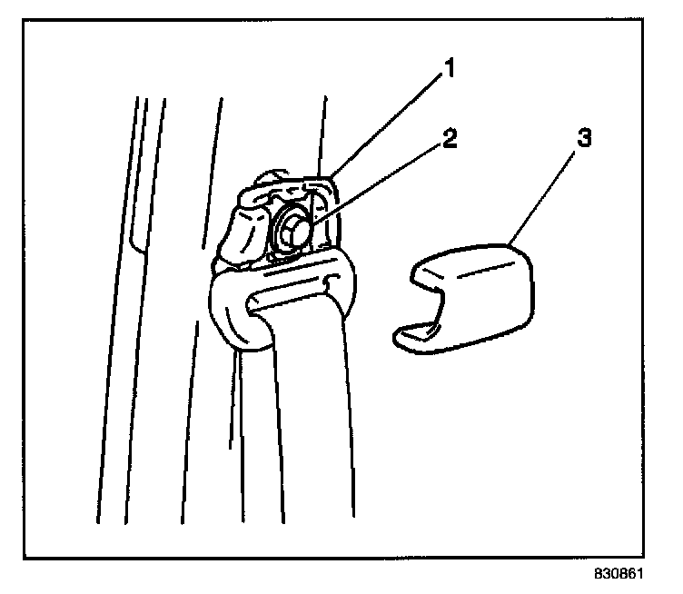 7. Remove the front seat shoulder belt guide adjuster trim cover (3) and the bolt (2).
