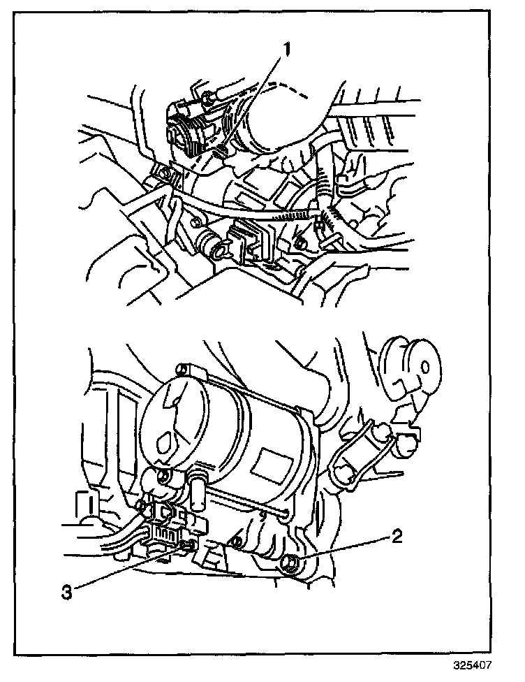 5. Remove the lower mounting bolt (2) and the starter motor from the vehicle.