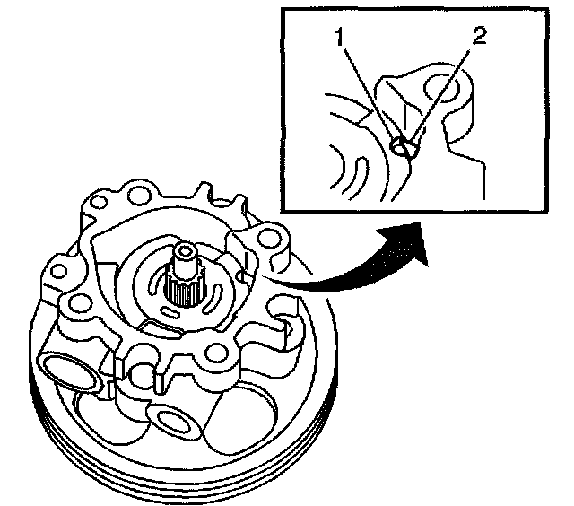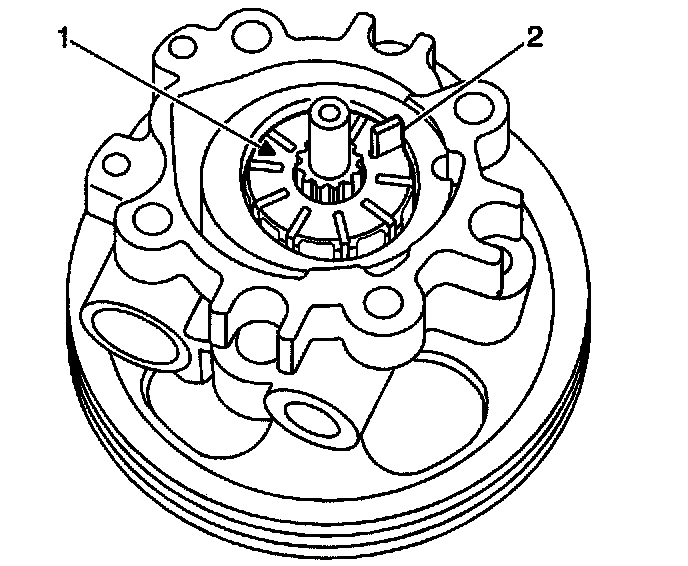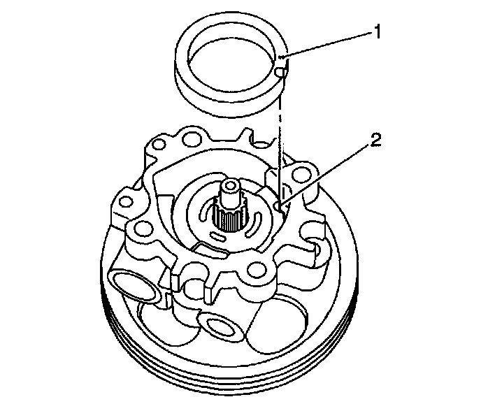 12. Align the notch in the pump ring with the tab on the front housing (2). Verify the stamping (1) will be toward the rotor.