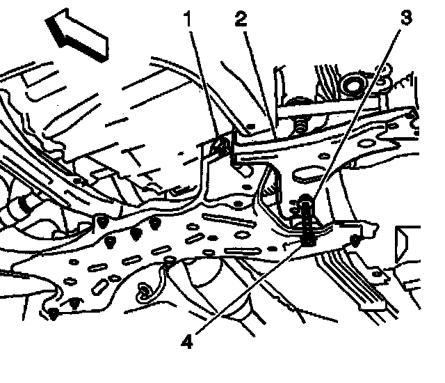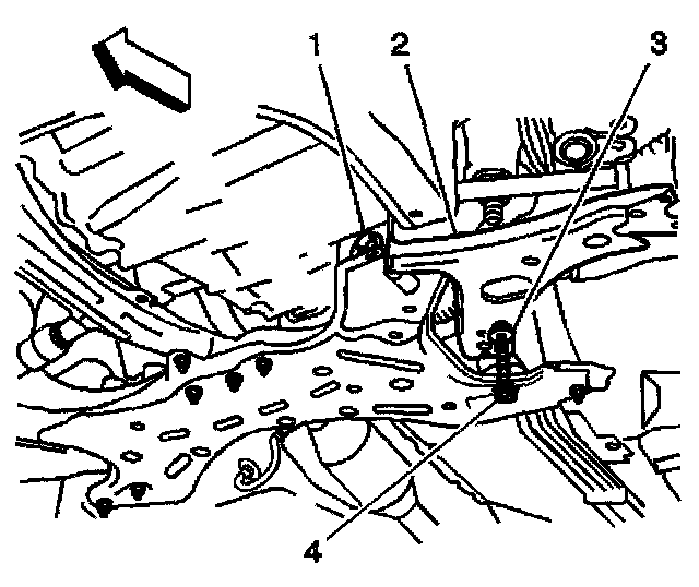 2. Remove the 2 bolts (1, 4) and the 1 nut (3) in order to remove the control arm from the crossmember.
