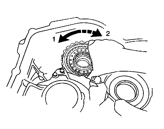 185. Turn the underdrive clutch assembly. The clutch assembly should turn freely counterclockwise (1) and should lock clockwise (2).