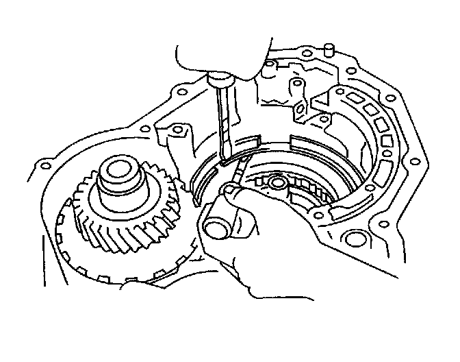 Transmission Overhaul Procedure Continued76. Using 2 screwdrivers, remove the snap ring from the transaxle case.