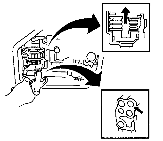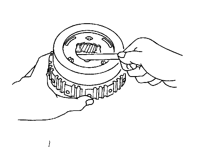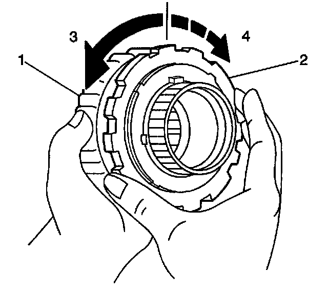 107. Hold the 1 way clutch drum (1) and turn the 1 way clutch (2). The 1 way clutch should turn freely counterclockwise (3) and should lock if turned clockwise (4).