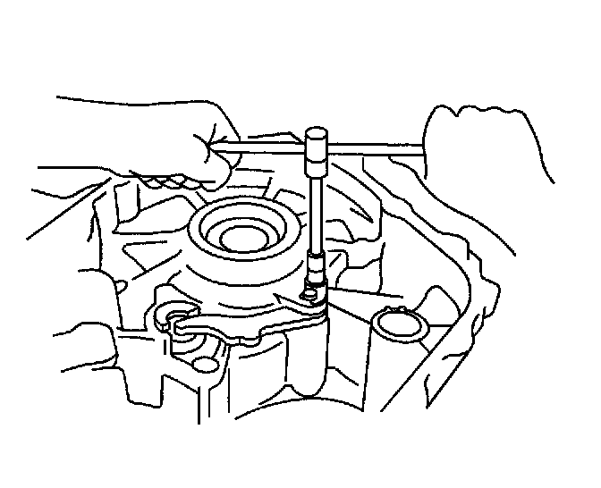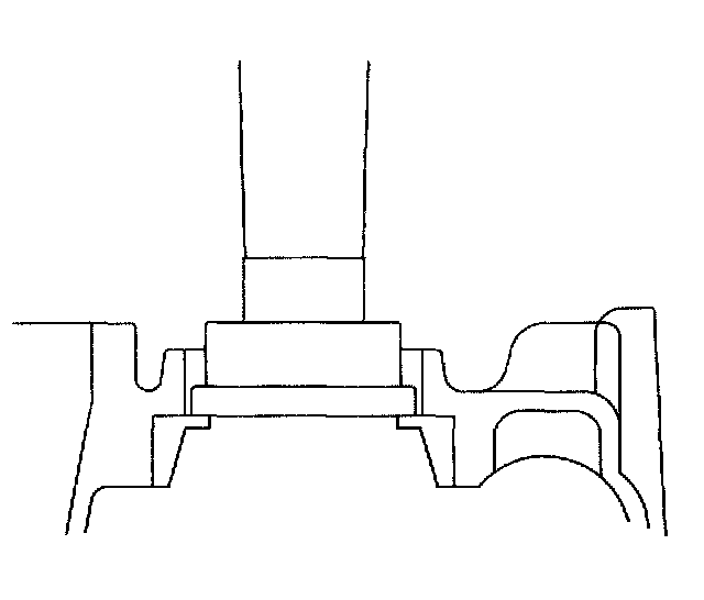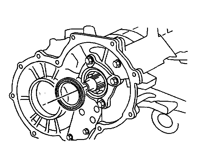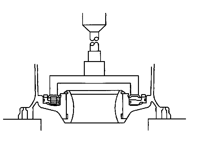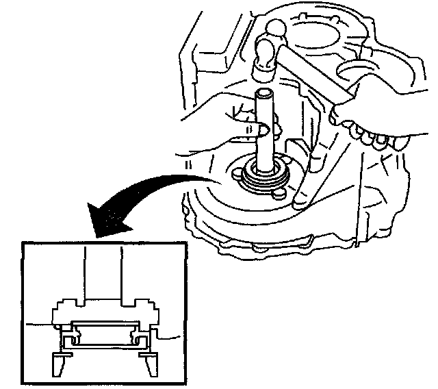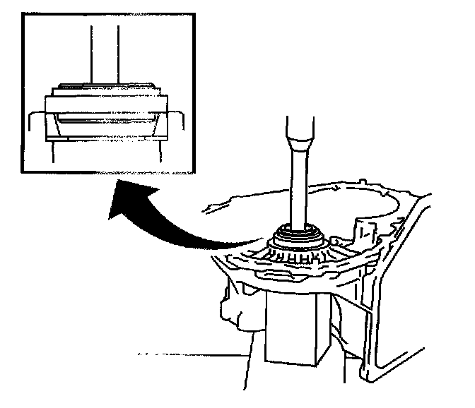 144. Using a press, install a new front drive pinion rear roller bearing outer race in the transaxle case.