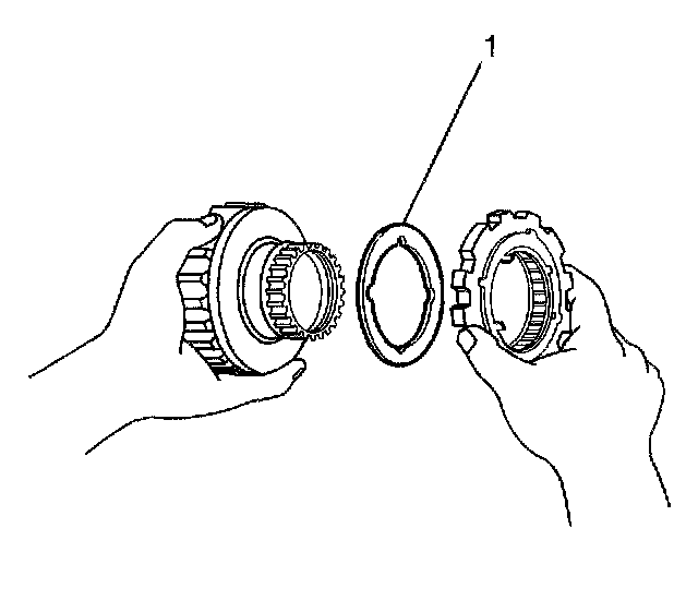 108. Remove the 1 way clutch assembly and the underdrive clutch drum thrust washer (1) from the underdrive clutch drum.