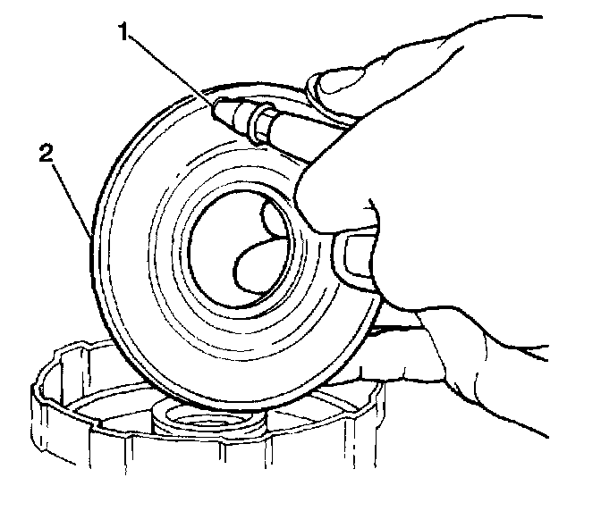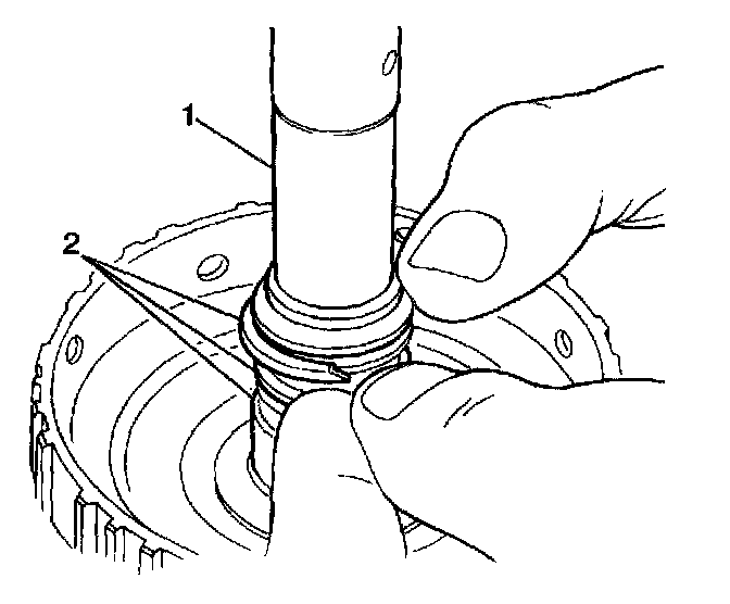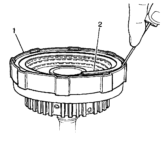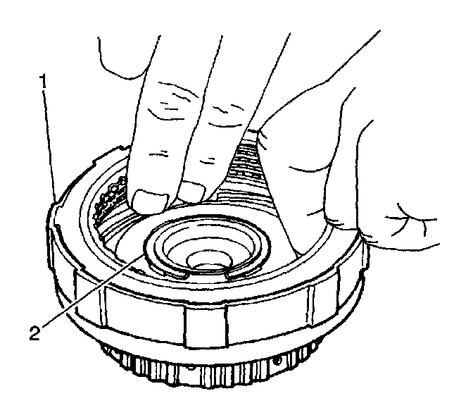 9. Remove the forward clutch piston (1) from the forward clutch drum (2) by applying low pressure compressed air into the forward clutch apply passage on the input shaft.