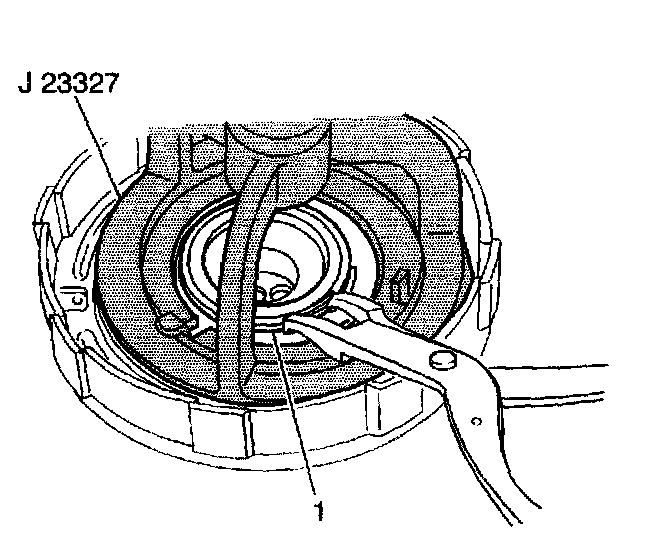 7. Use the J23327 and a hydraulic press to remove the forward clutch piston return spring snap ring (1) from the forward clutch piston return spring retainer.